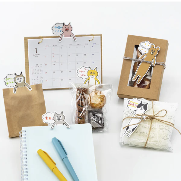 猫や熊のほか、着ぐるみを着たキャラクターなど、アイデア次第でさまざまなおもしろメッセージシールを制作可能。
