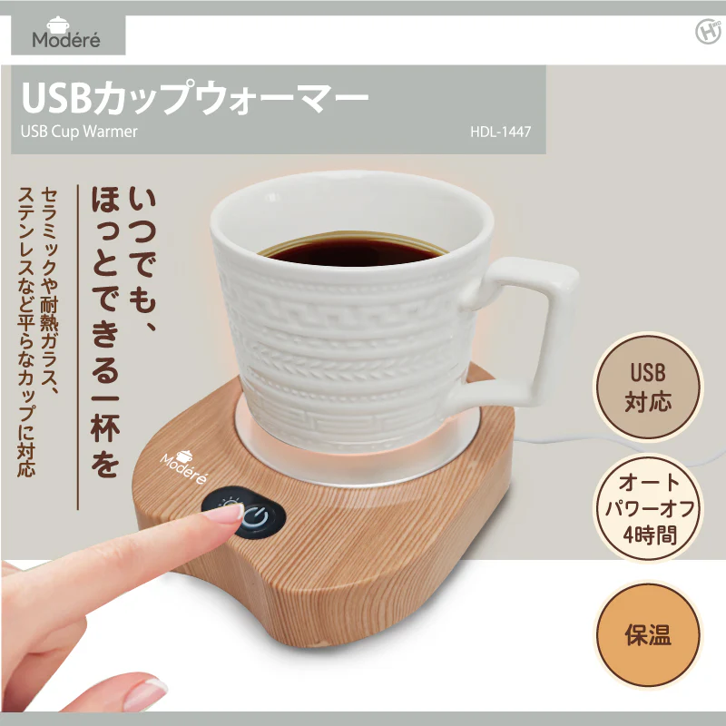 USB対応なのでオフィス、会議室、デスクなどどこででも飲み物の温かさをキープできる。