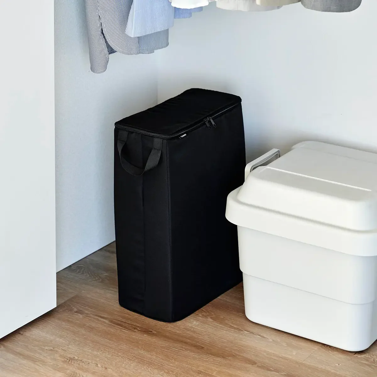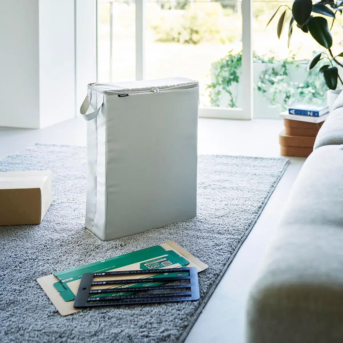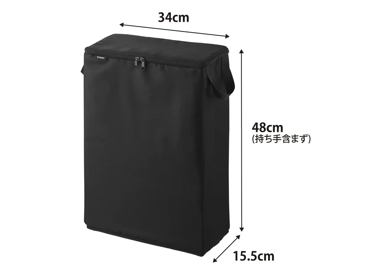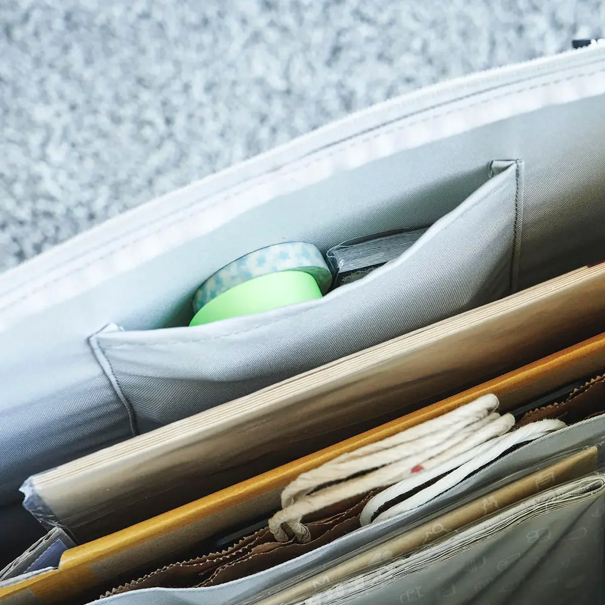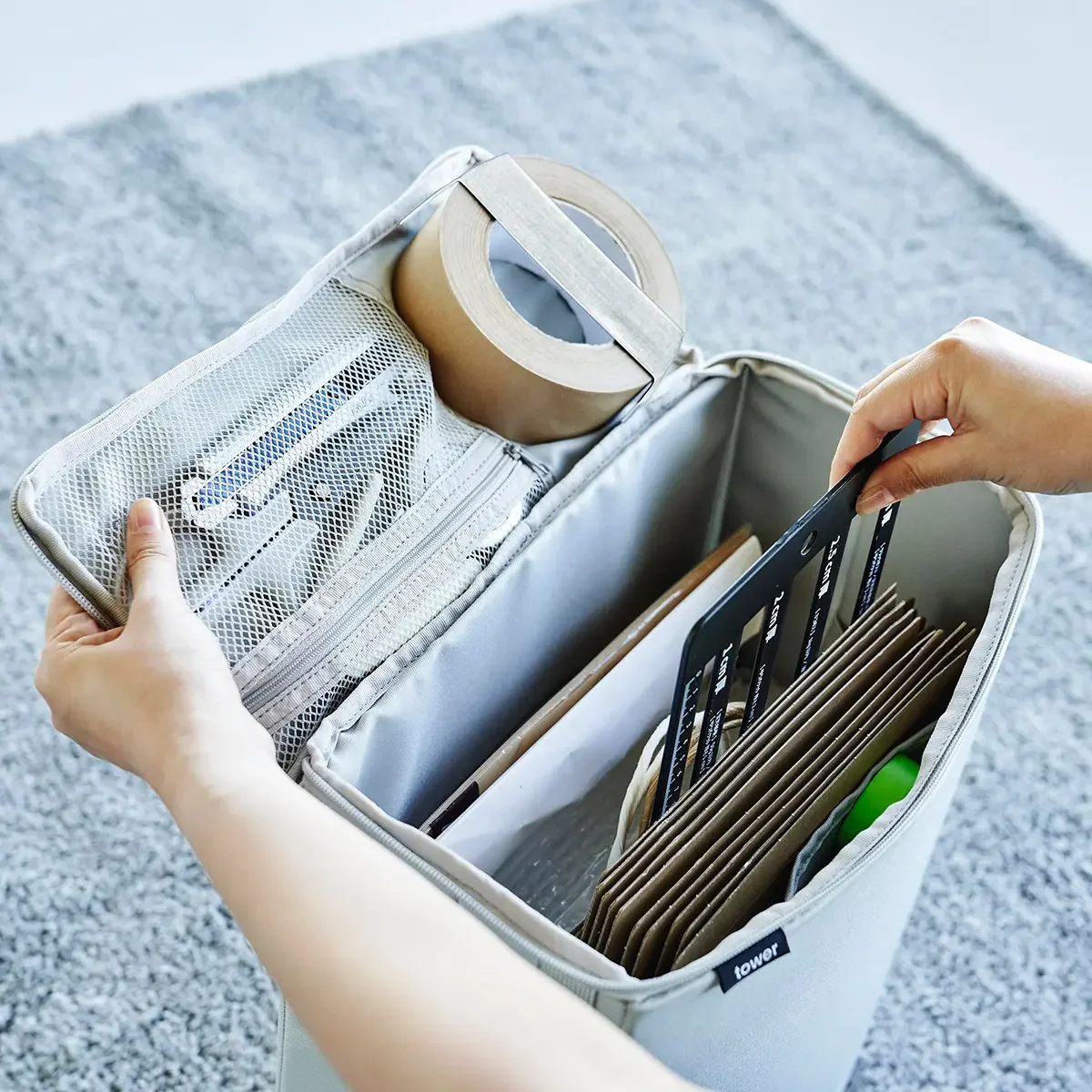 蓋の内側のゴムバンドには粘着テープを収納することができます。カッターやハサミなど梱包時に使用する道具を収納できるファスナー付きポケットや小物を収納できる内ポケット、資材を種類ごとに整理しやすい仕切り付きです。幅15.5cmのスリムサイズなので省スペースに収納可能。左右に持ち手が付いているので持ち運びもラクです。