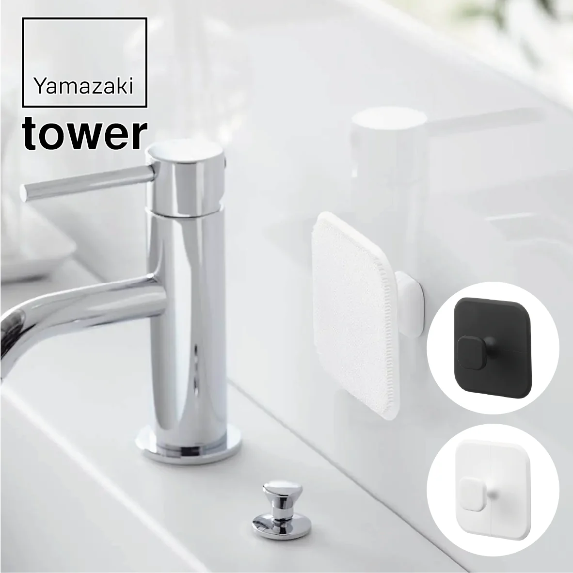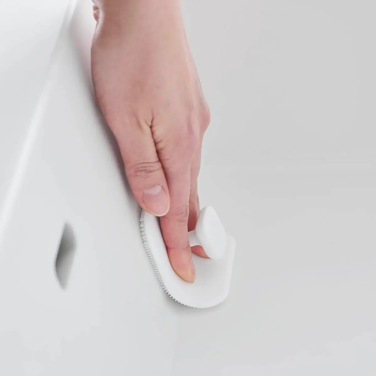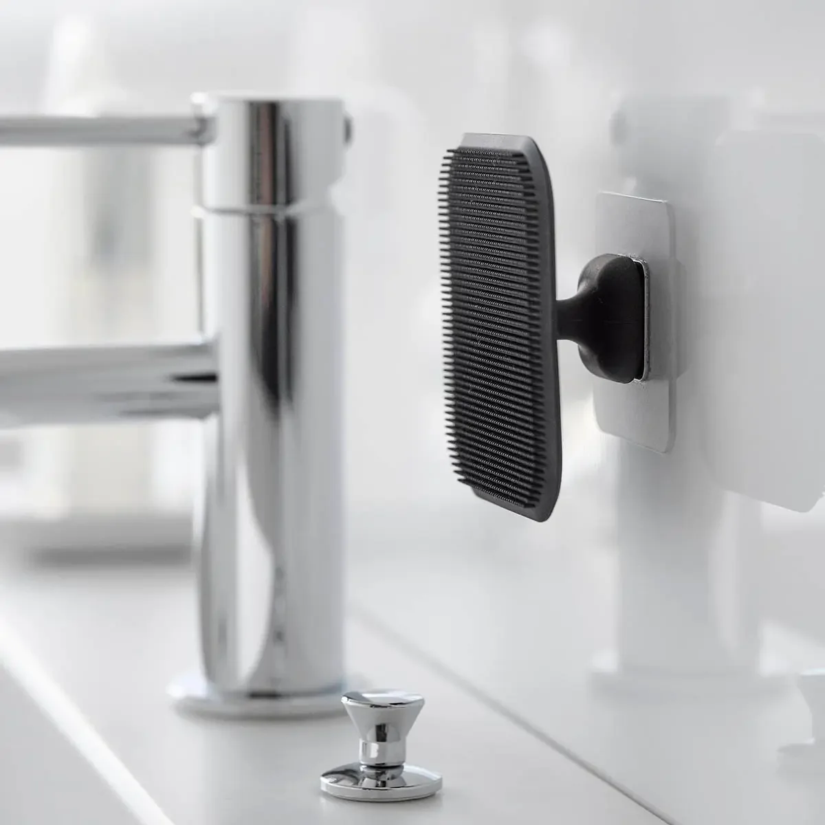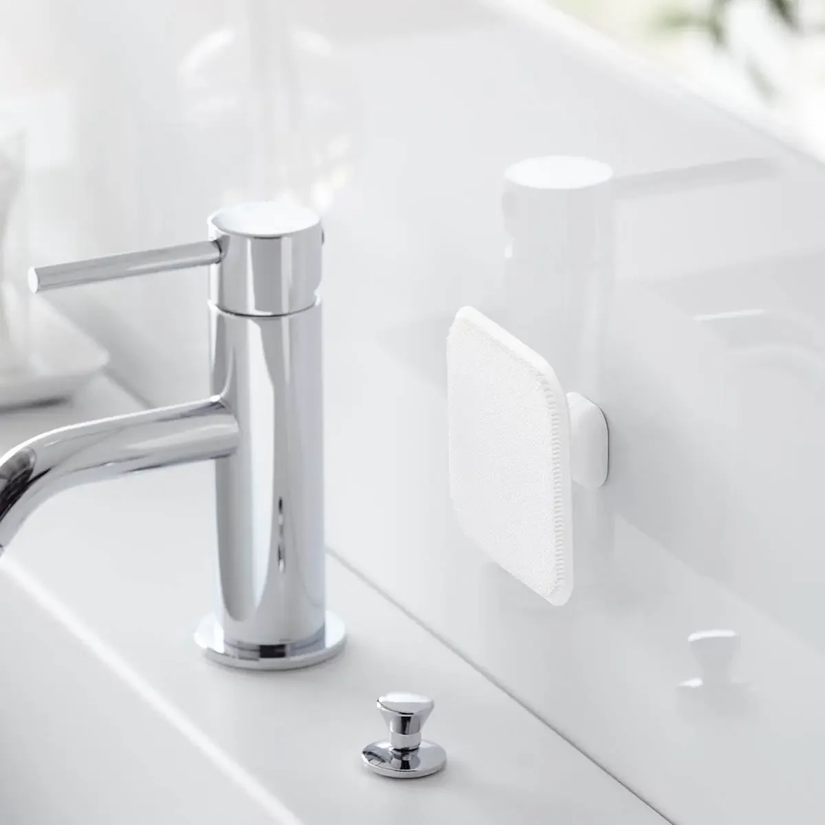 マグネットで壁面に収納できるので、汚れに気づいた時にサッとお掃除できて便利!洗面台では、カーブに沿ってしなやかにフィットしてしっかり掃除ができます。スクイージーとして、洗面シンク周りの水切りにも活躍。収納の際、スポンジ面が壁面に触れないので衛生的です。