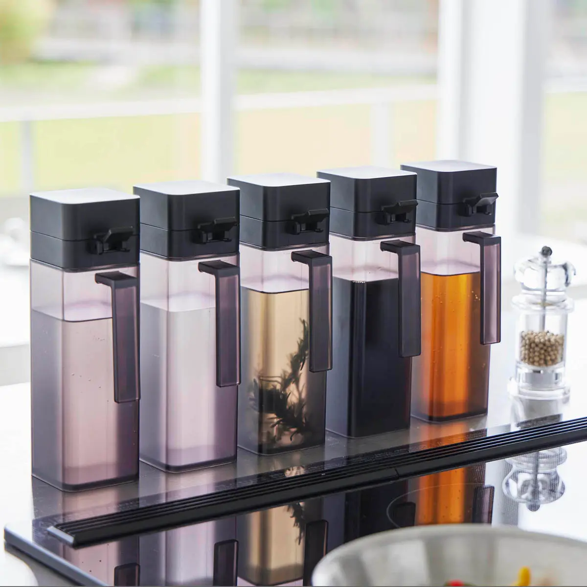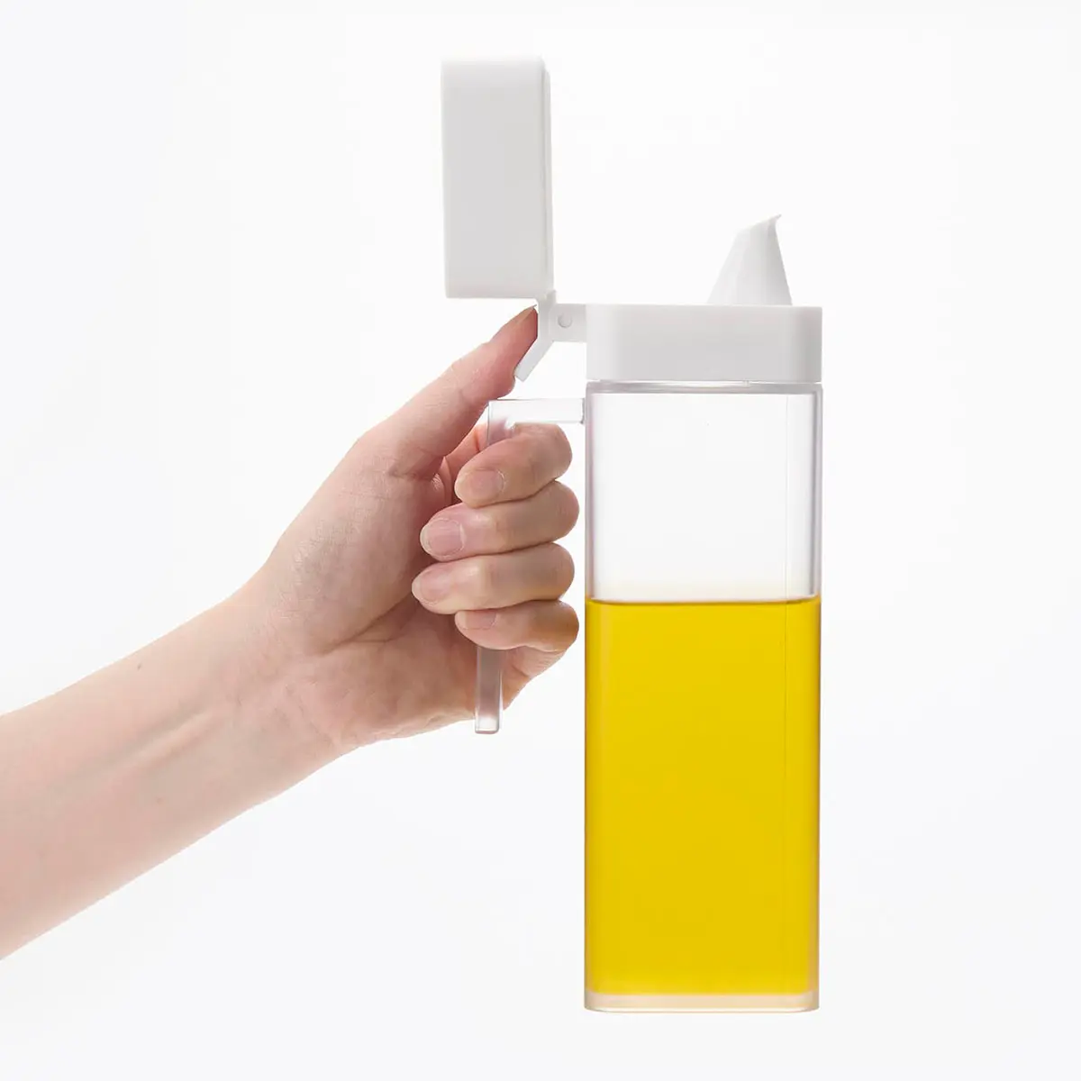 蓋付きの液体調味料詰め替えボトルです。液だれしにくいノズルで、蓋は親指で簡単に開閉でき、開いた状態を保ちながら注ぐことができます。蓋は取り外せるので、詰め替えやお手入れが簡単。