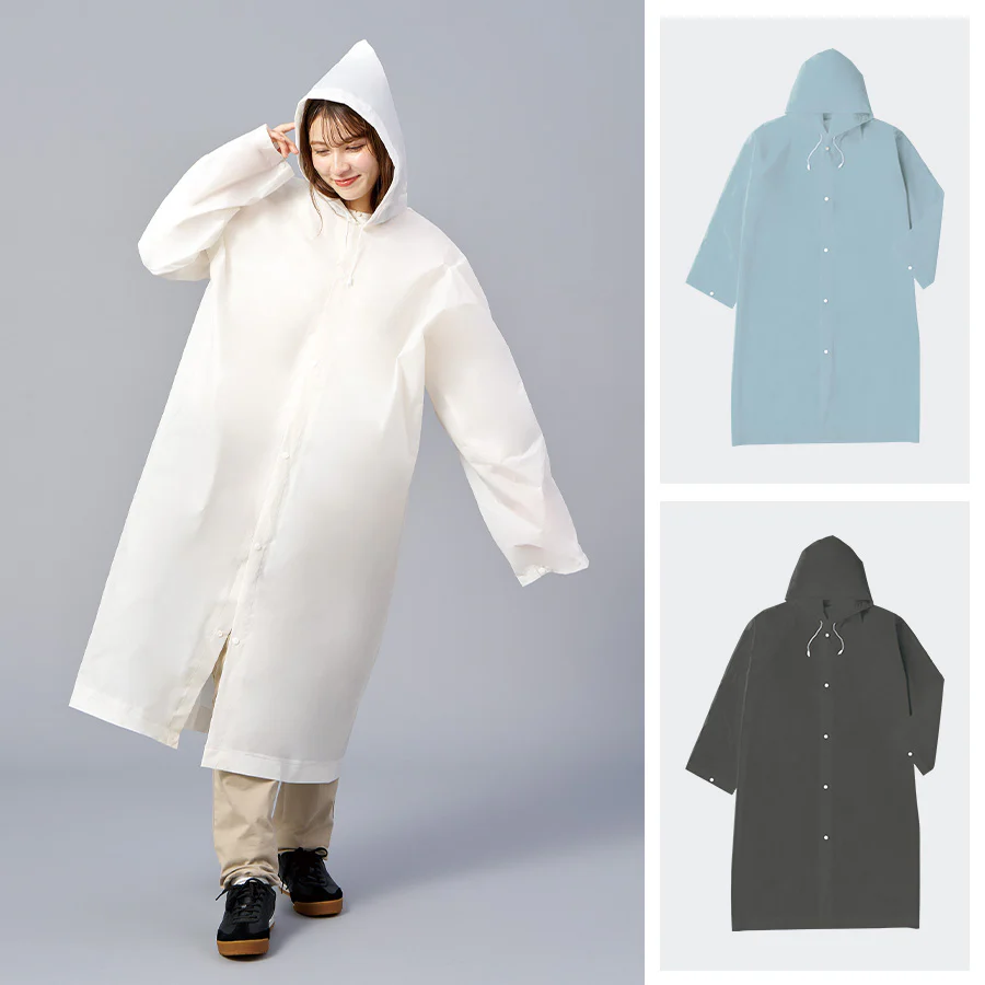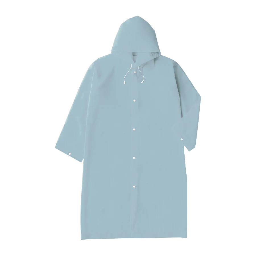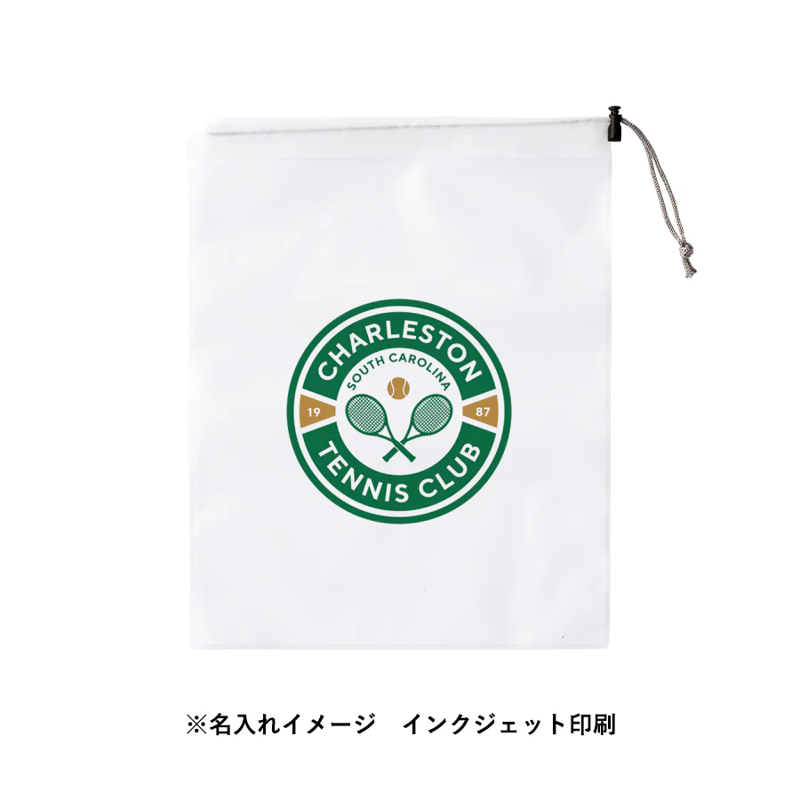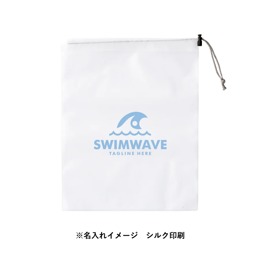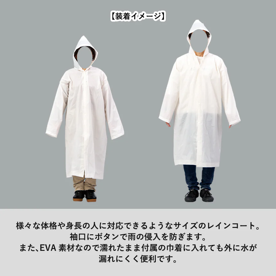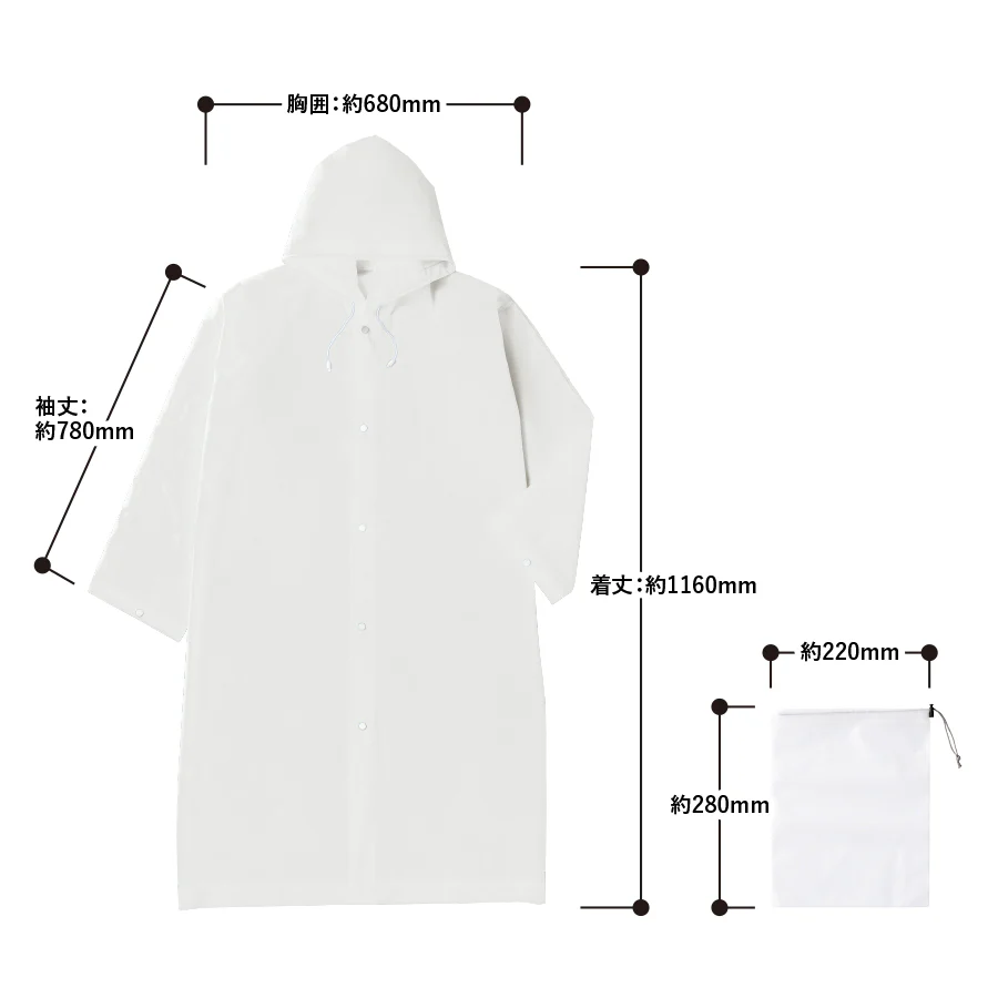 EVA巾着付きのレインコートです。身長の高い方もひざまで隠れる着丈に設定し、様々な体格の方に対応できるようなサイズ感です。袖口にボタンがついており、雨の侵入も極力防いでくれます。巾着はEVA素材を使用しているため、レインコートを濡れたまま収納しバッグに入れても水が漏れにくい仕様です。EVA巾着に単色またはフルカラー印刷が可能なため、ロゴやマークを名入れすればマラソン大会や野球観戦などのスポーツイベントのグッズやアウトドア関連のノベルティとしてご提案いただけます。